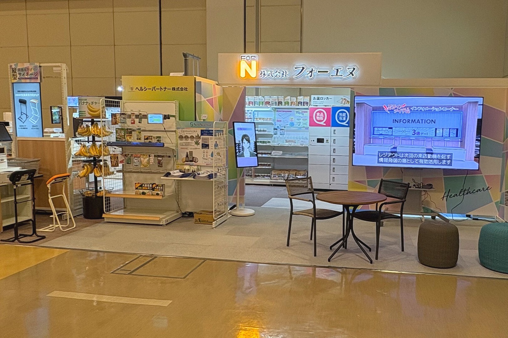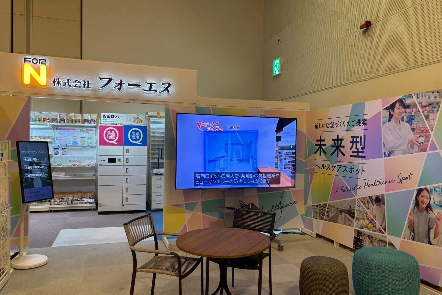 什器ブースでは店舗陳列什器、調剤什器、抗菌噴霧ゲートなどの展示・紹介を行いました。